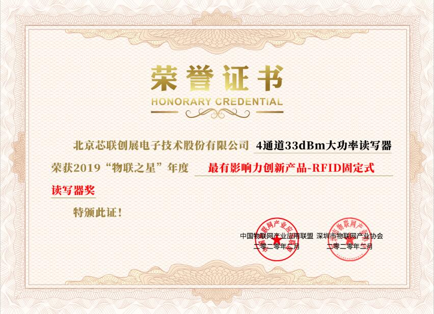 再次从400多家参选企业中脱颖未出,荣获2019“物联之星”年度最有影响力创新产品-RFID固定式读写器奖。