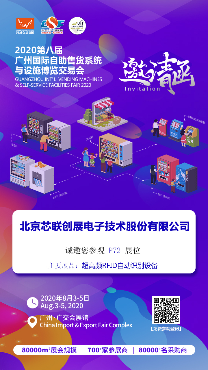 2020广州国际商业博览会暨第八届广州国际自助售货系统与设施博览交易会(简称CSF)将于8月3日—8月5日在广州·广交会展馆举行。北京 将会参加此次盛会,展示适用于新零售和无人零售的超高频RFID自动采集设备,欢迎各位新老朋友莅临。